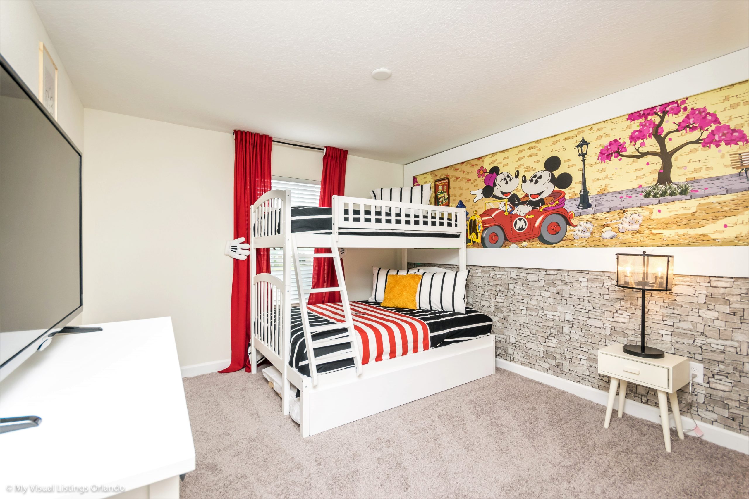 Each bedroom features its own large flat screen TV. The ground floor bedroom features a queen size bed, while upstairs are three additional rooms. A master suite has a King size bed and a spacious bathroom. There are also two children themed bedrooms, sharing a bathroom.