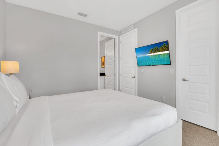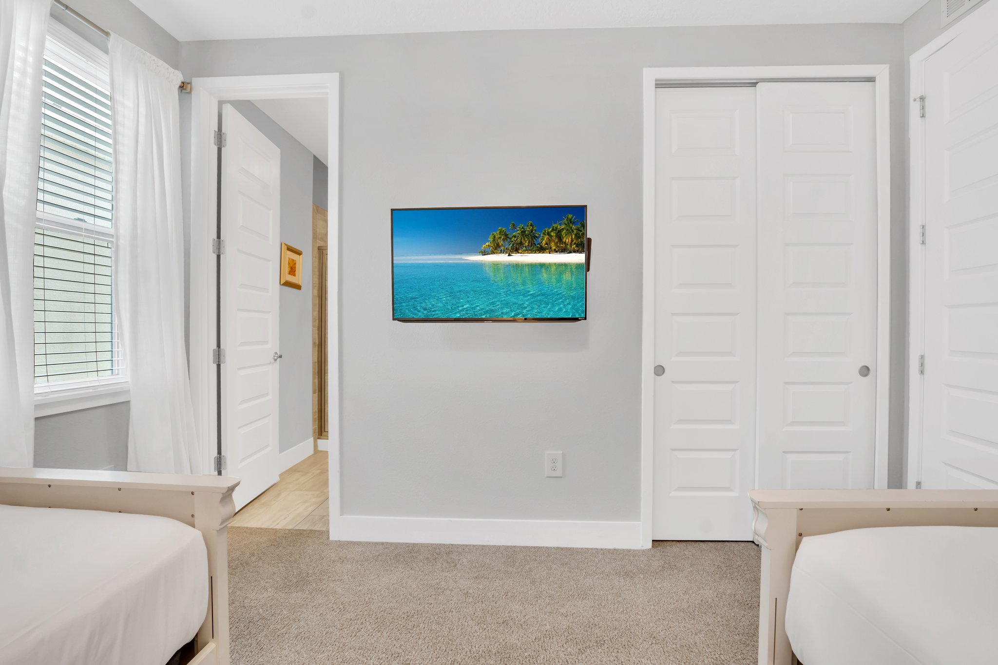 Down the hall, you will find a room with two twin beds and a bubble gum colored wall. This rosy room is perfect for children who want to feel like they are having a sleepover so far away from home! These princesses will enjoy their private bathroom with a walk-in shower and a flat-screen tv. Disney movie marathon anyone?
