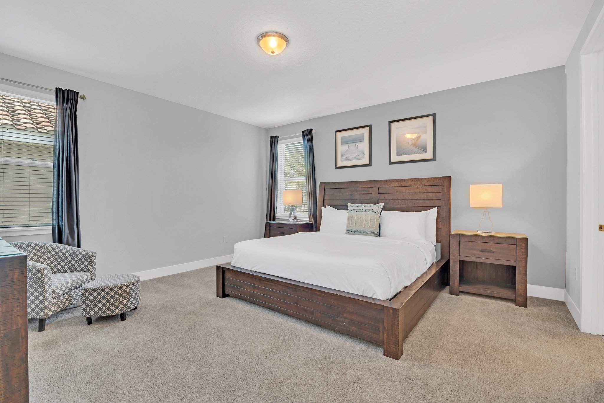 Wander upstairs into the master suite complete with a king-size bed, luxury chair and a flat-screen tv.. This boho style room will remind you of a bed you might find relaxing on the beach. Close your eyes and imagine the sound of the waves soothing you to sleep as you lay on the sand and watch the stars fade into the sky. The luxurious en-suite bathroom includes a walk-in shower with double sinks. You might mistake it for an in-house spa!