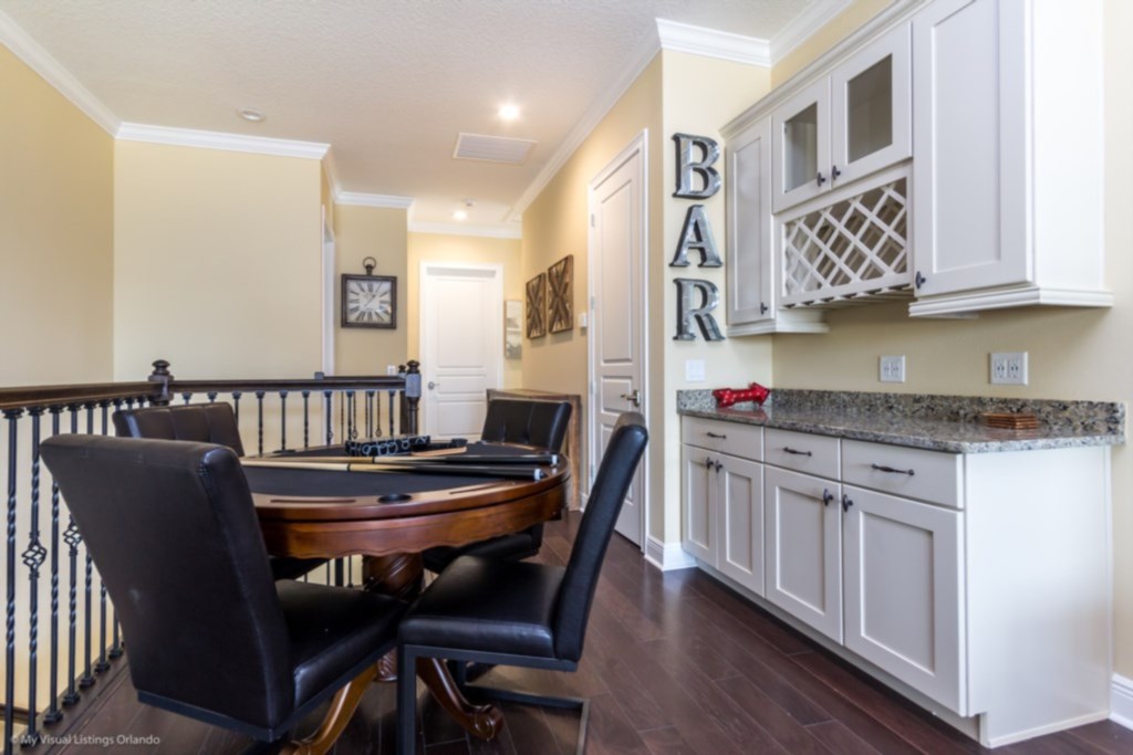 Games room has a large sectional, globe chair, air hockey table, flat screen TV with games console, wet bar, and access to a balcony (furnished)
