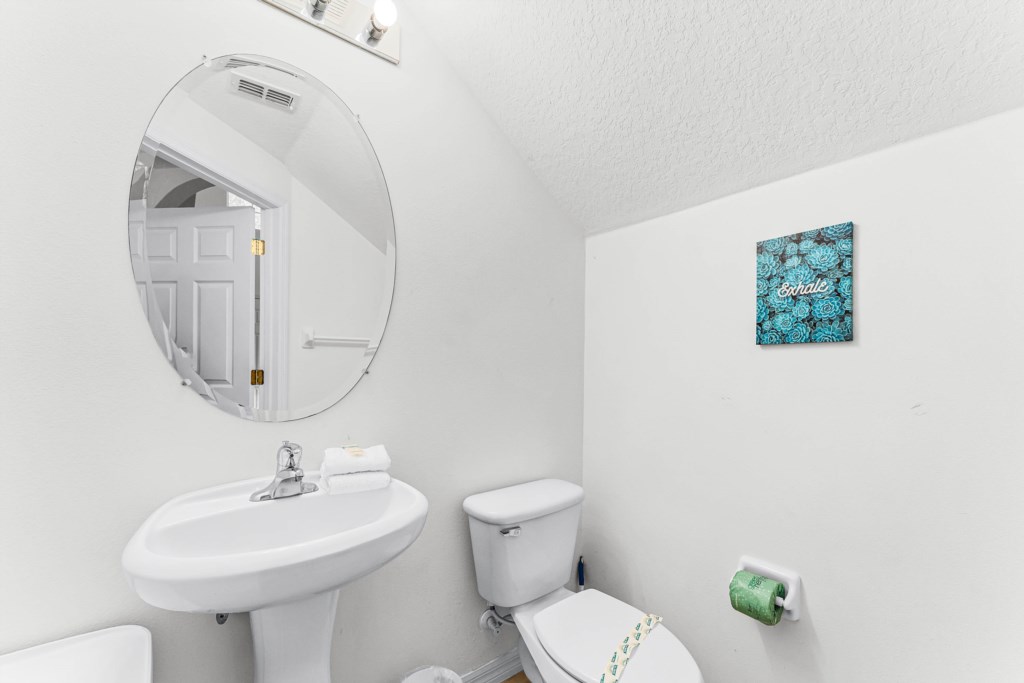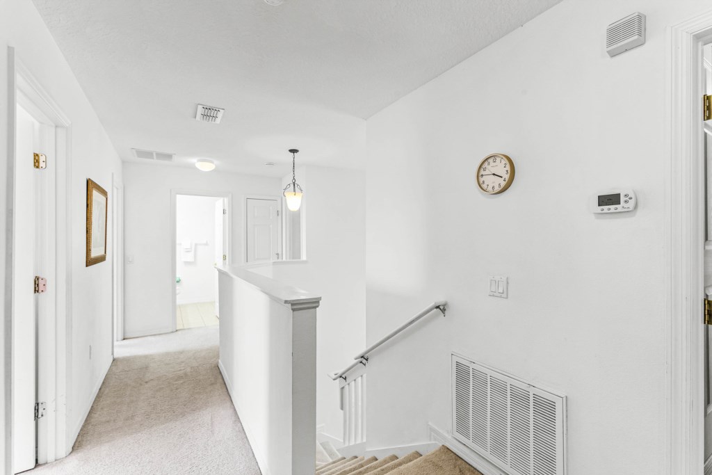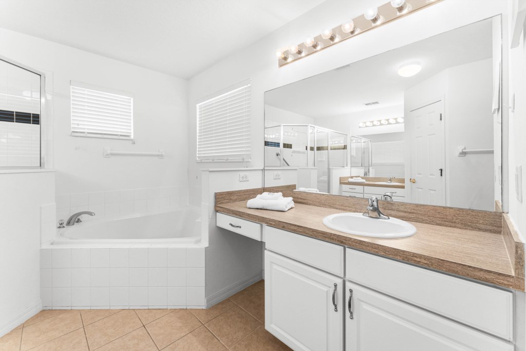 The pool is South facing! There are 4 bedrooms upstairs, 2 of which have an ensuite bathroom. The 2 other rooms share a bathroom. The master bedroom has a walk-in closet and the master bathroom has a tub, dual vanity and a large walk-in shower. The utility room is upstairs and washer and dryer convey with the property!