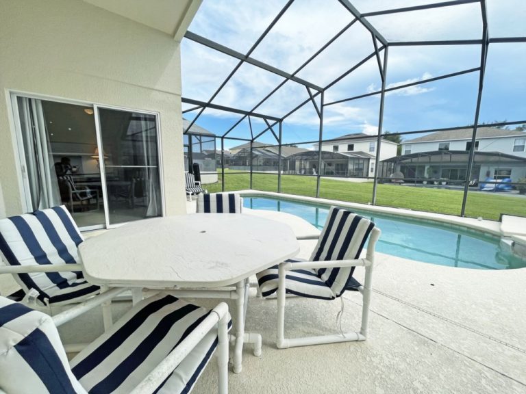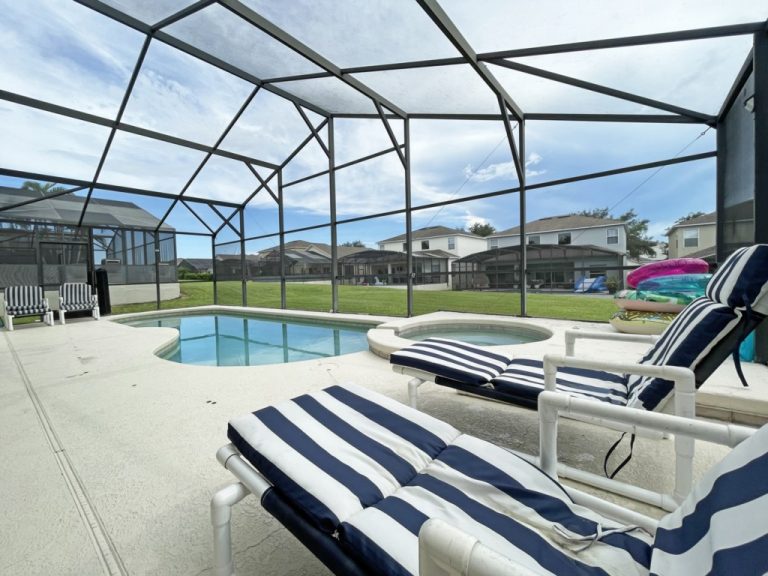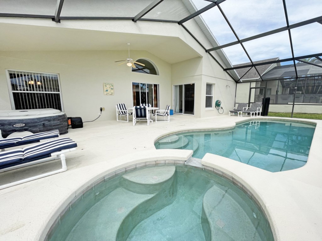 Outdoors there is a covered shaded area with table and chairs. For those looking to soak up some Florida sunshine, this pool deck faces south to enjoy the sun throughout the day. There are loungers to relax, or why not sink into the hot tub and enjoy a cool drink. Pool/hot tub available at an additional cost.