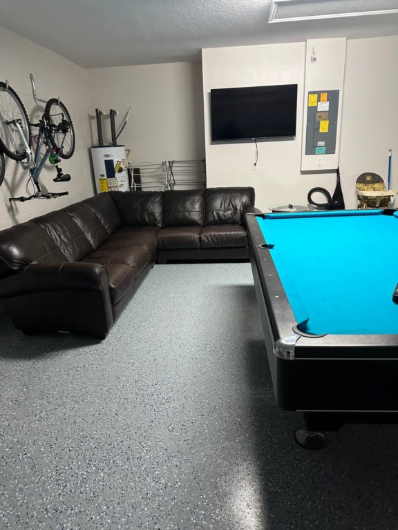 The garage floor in this property has been painted and sealed . It’s sole purpose is for guests to use it for a games room only.
