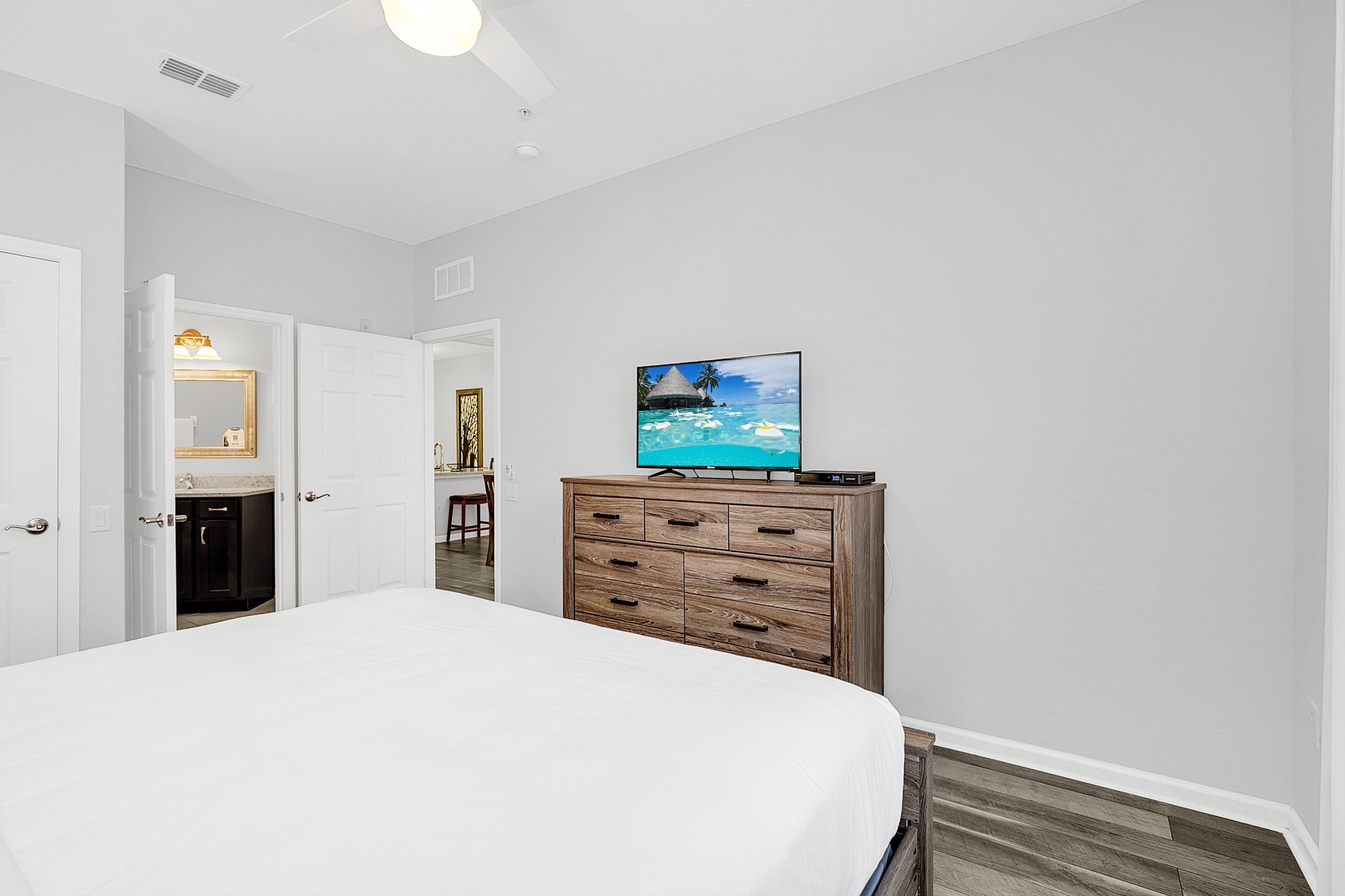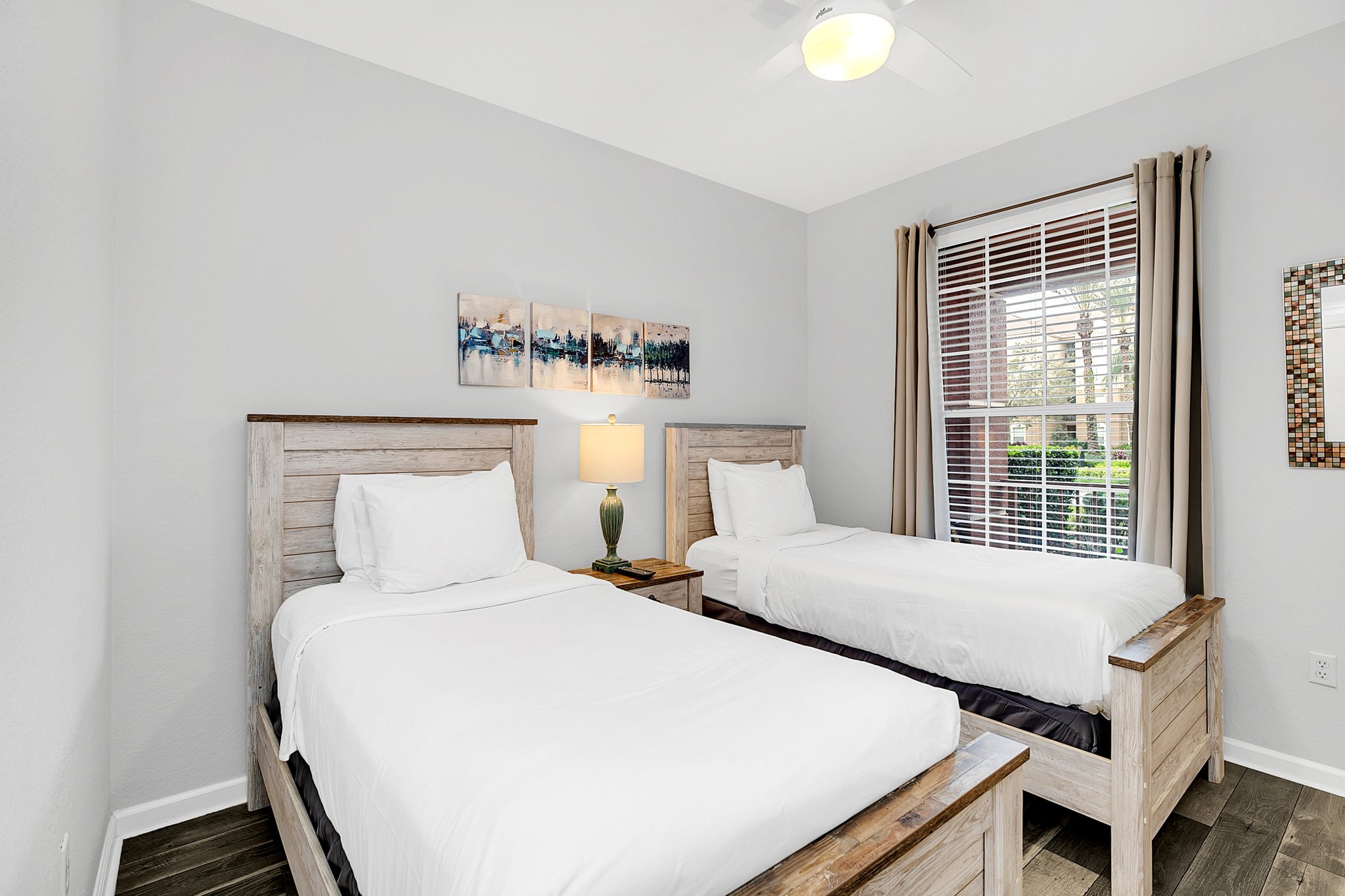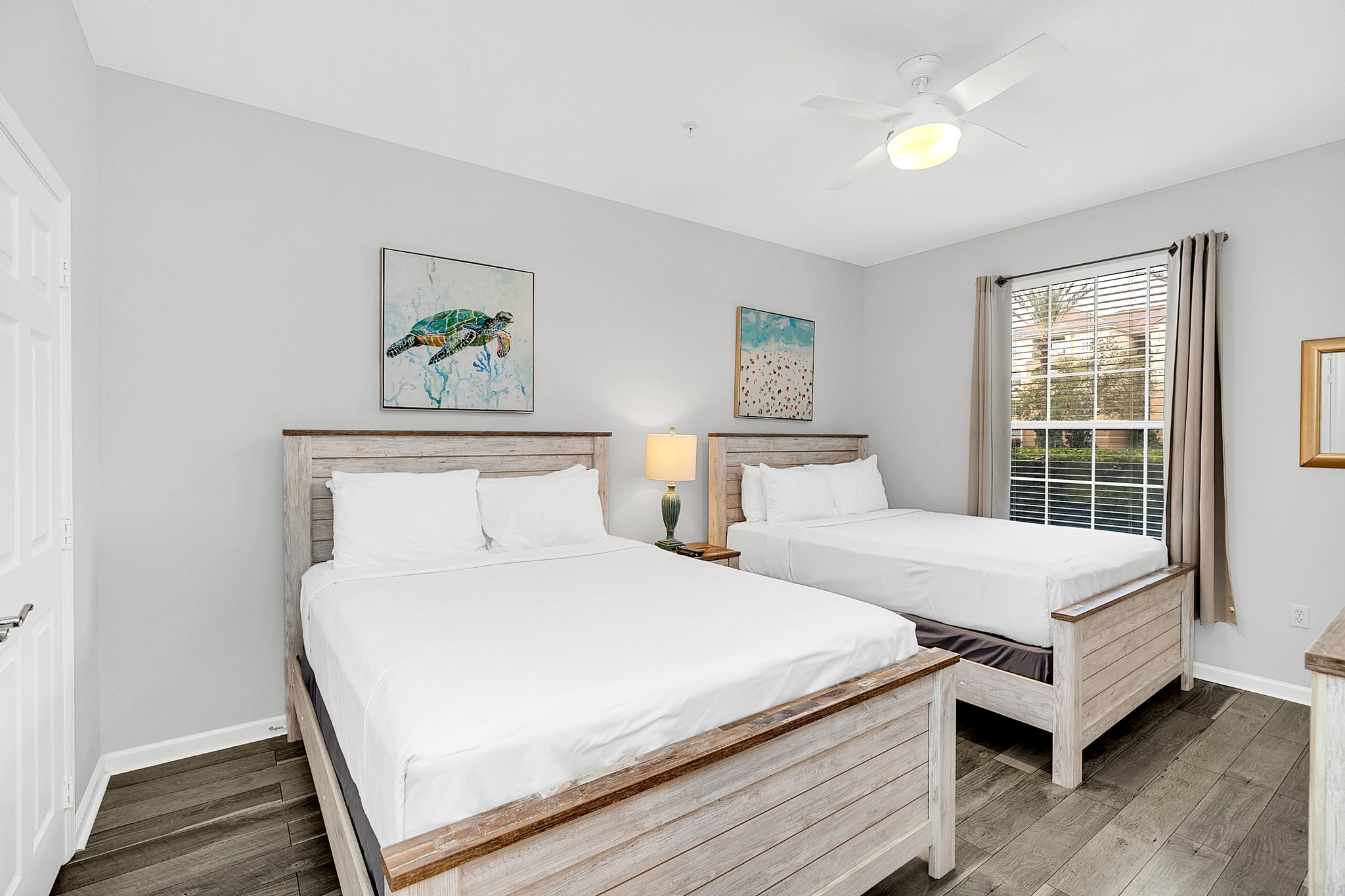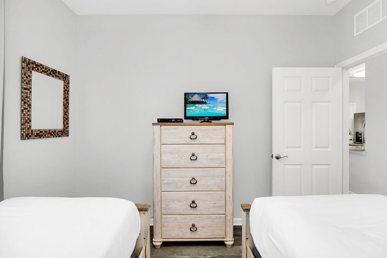 The warm hardwood floors in the main living area also run throughout the first bedroom. Here, you’ll enjoy sweet dreams in the king bed and access to a large, en-suite bathroom with walk-in shower. Pops of blues and greens give the second bedroom a fun vibe; it’s equipped with two twin beds. A third bedroom has extra sleeping space with two full beds. Another large bathroom provides plenty of space for all your guests.
