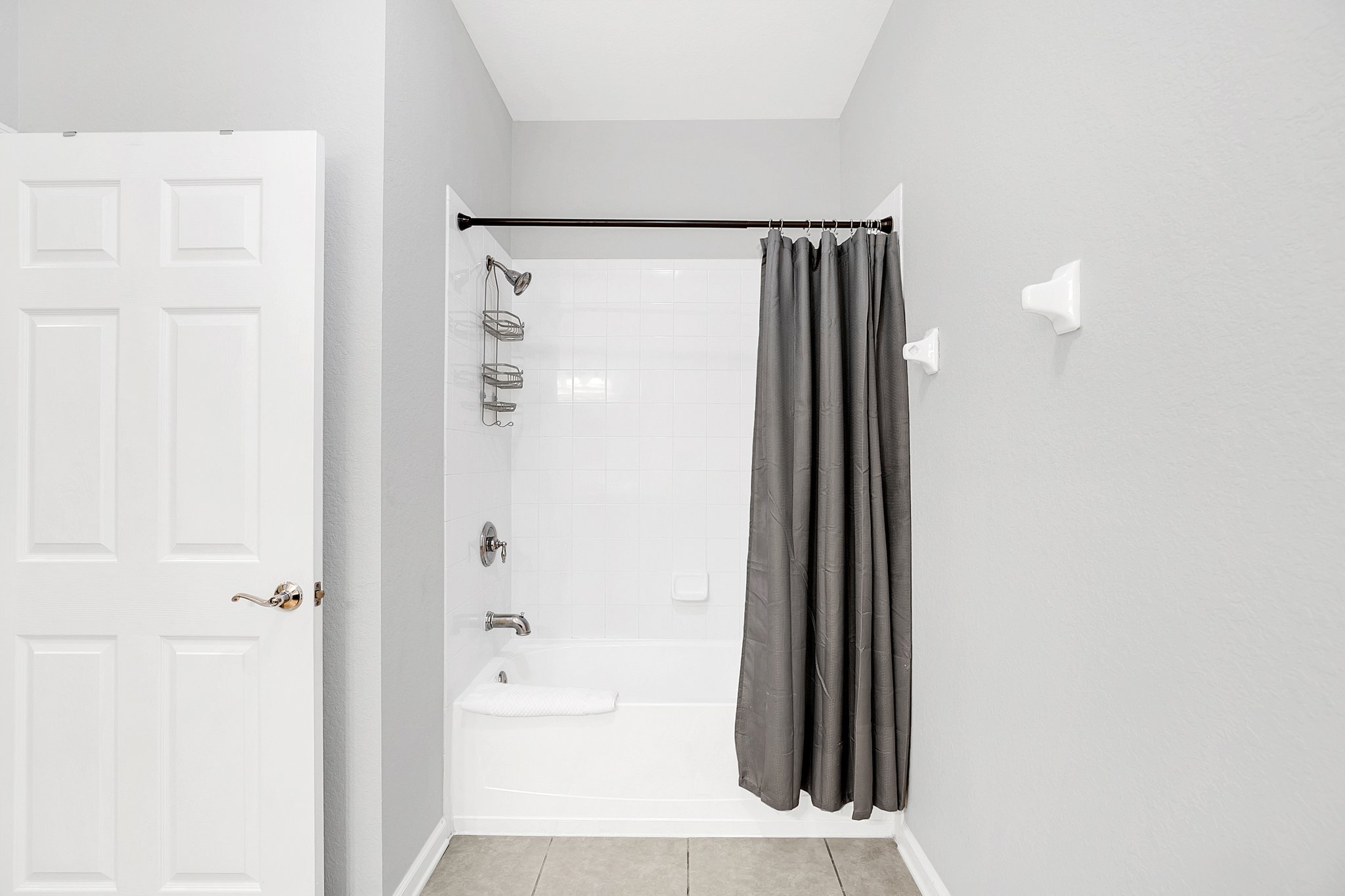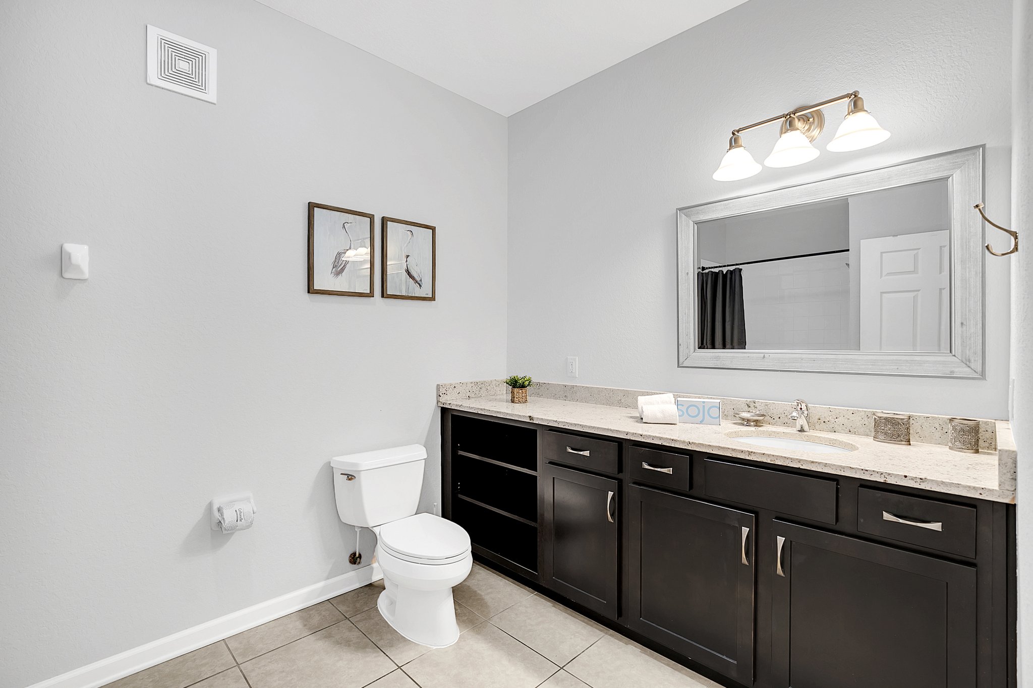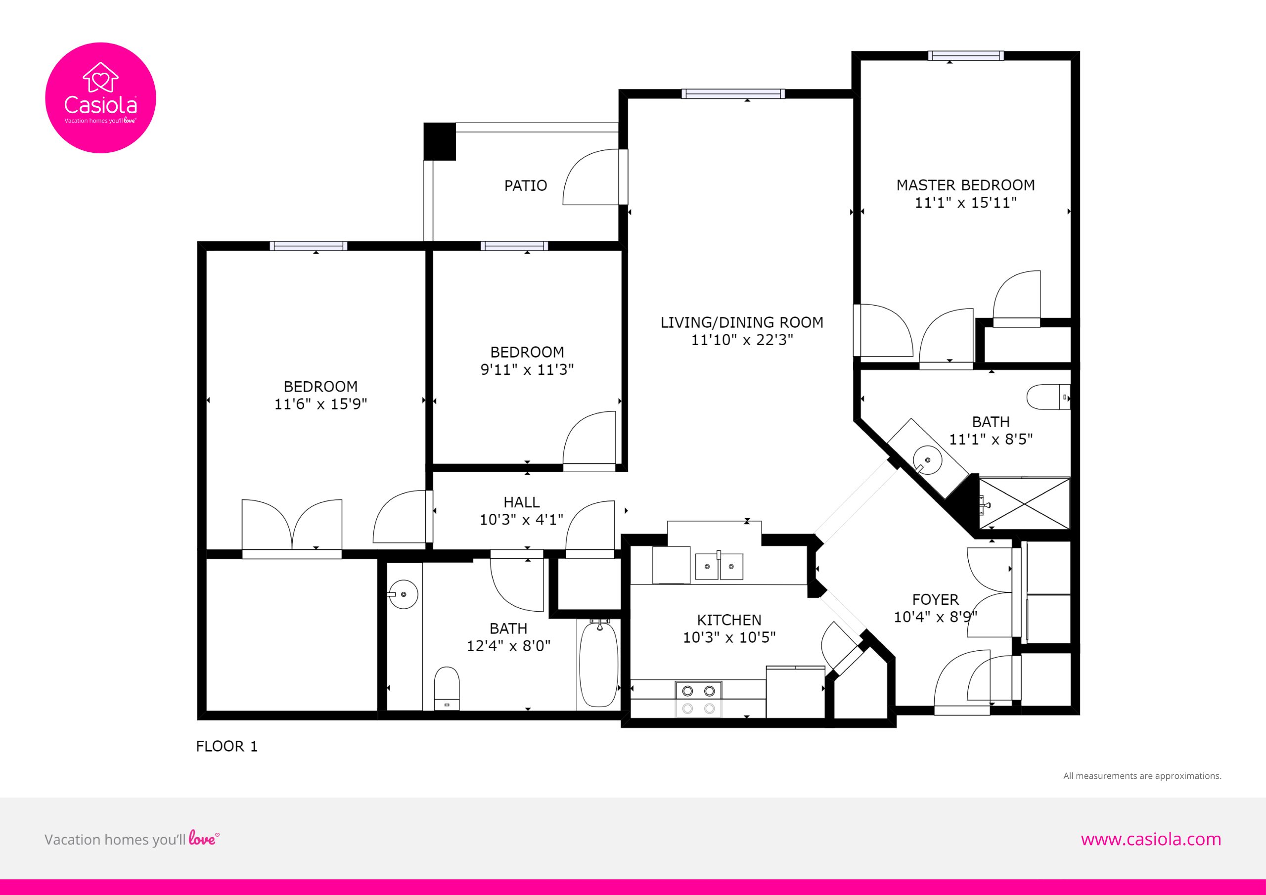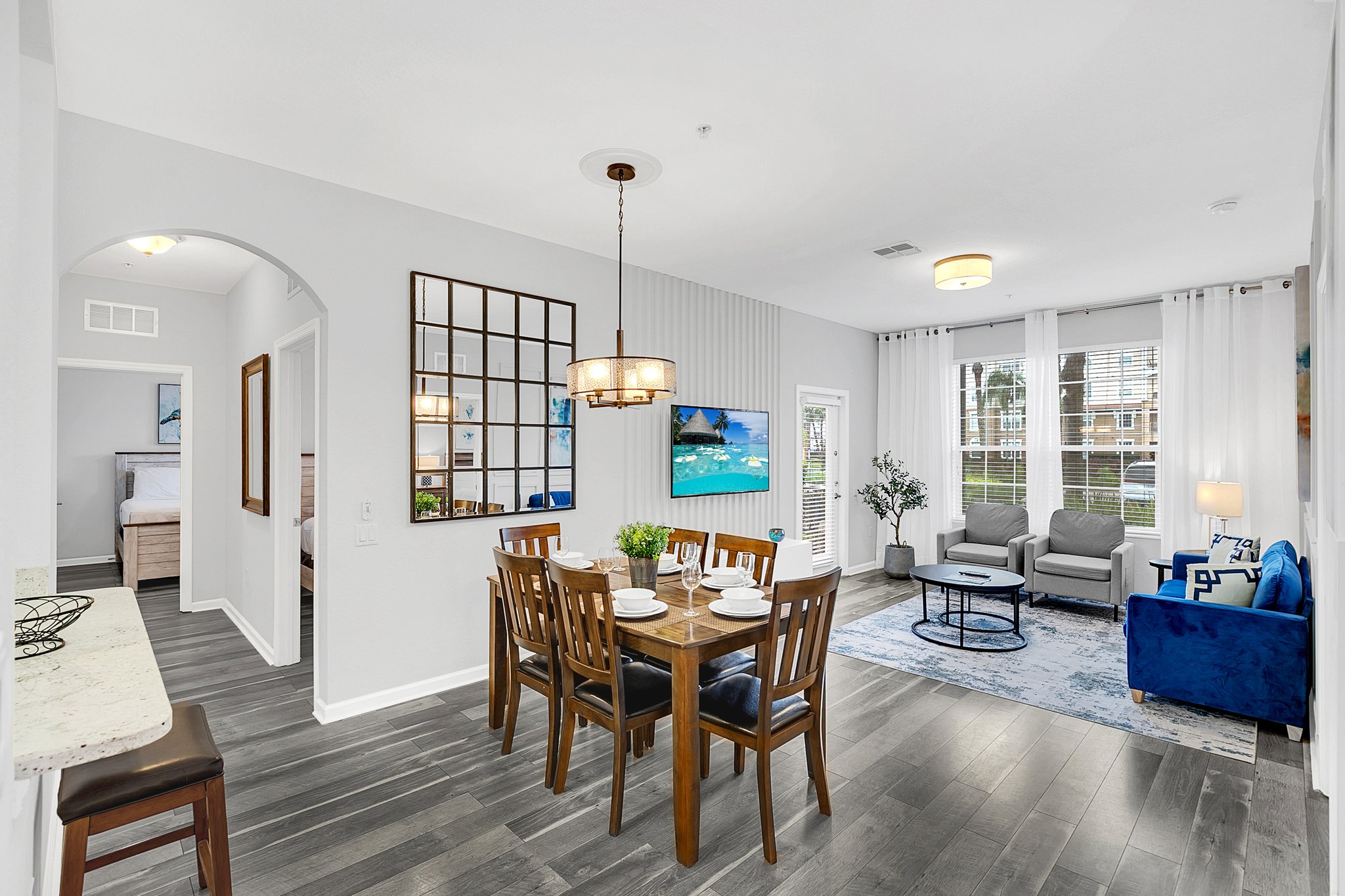 The warm hardwood floors in the main living area also run throughout the first bedroom. Here, you’ll enjoy sweet dreams in the king bed and access to a large, en-suite bathroom with walk-in shower. Pops of blues and greens give the second bedroom a fun vibe; it’s equipped with two twin beds. A third bedroom has extra sleeping space with two full beds. Another large bathroom provides plenty of space for all your guests.