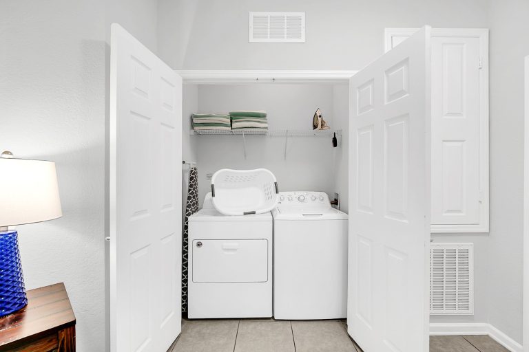 After a long day at the parks, relax and unwind in the comfortable living room with plush couch and loveseat. The living room also has a large flat-screen TV with DVD player and door out to a private patio. Soak in the peace and quiet and lush greenery views from the patio, sipping on a cold drink in one of the bistro chairs.