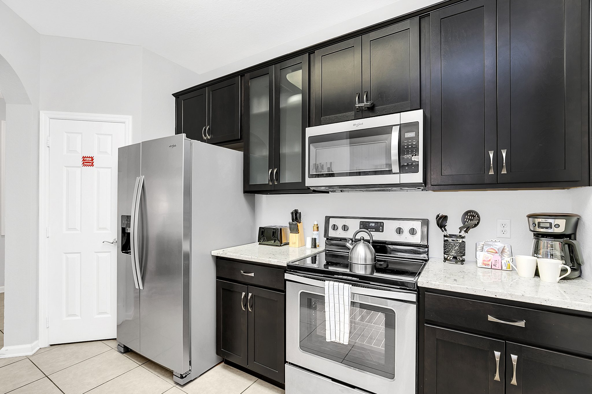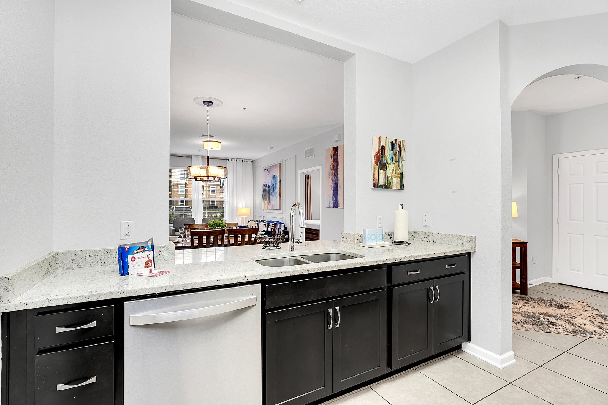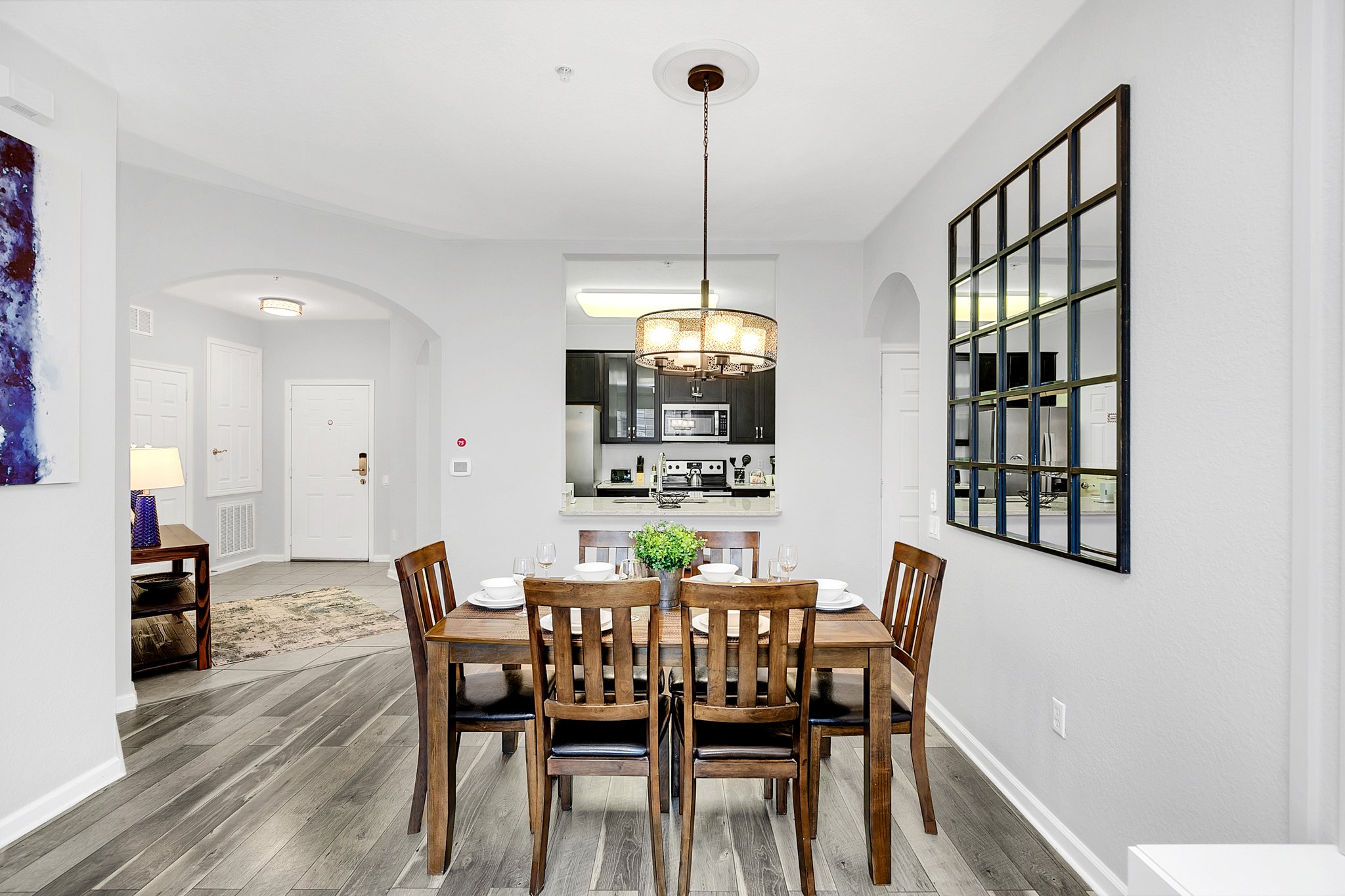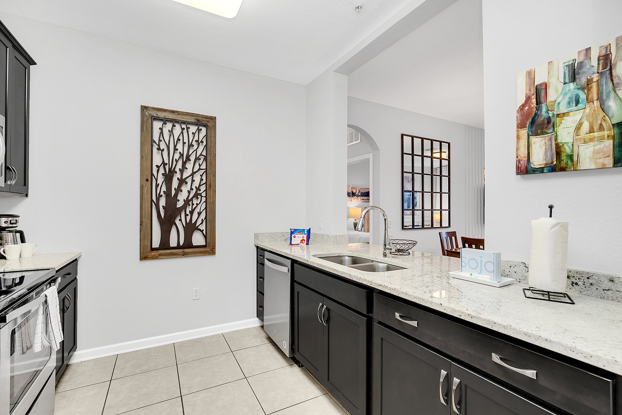 Dark wood cabinets perfectly complement the light-colored granite counters in the galley-style kitchen. The fully-equipped kitchen comes with stainless appliances and little extras like a toaster and coffee maker, everything you need for breakfast, dinner and everything in between. Gather around the formal dining table, which joins the kitchen to the living room and seats six comfortably.