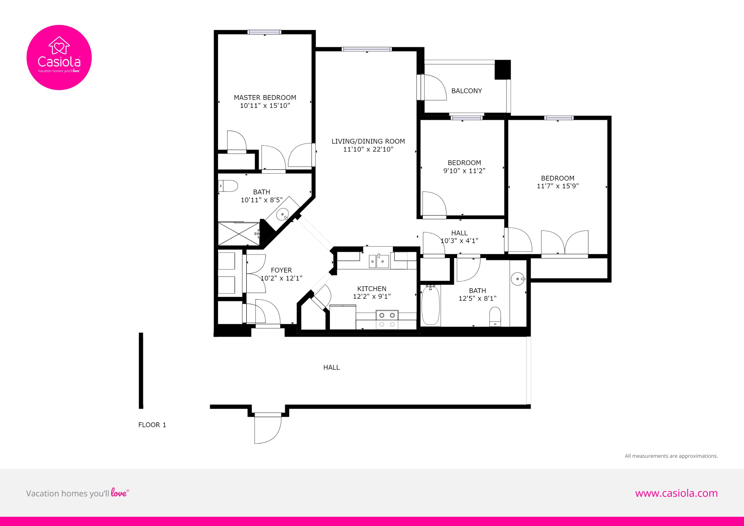 The master suite houses one king bed, a second bedroom has a queen bed and the third bedroom has two full beds. All bedrooms have their own flat screen TV. This beautiful condo can easily accommodate eight guests.