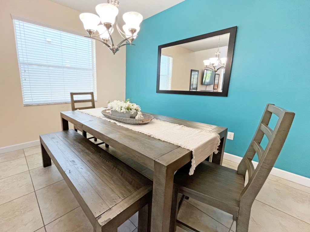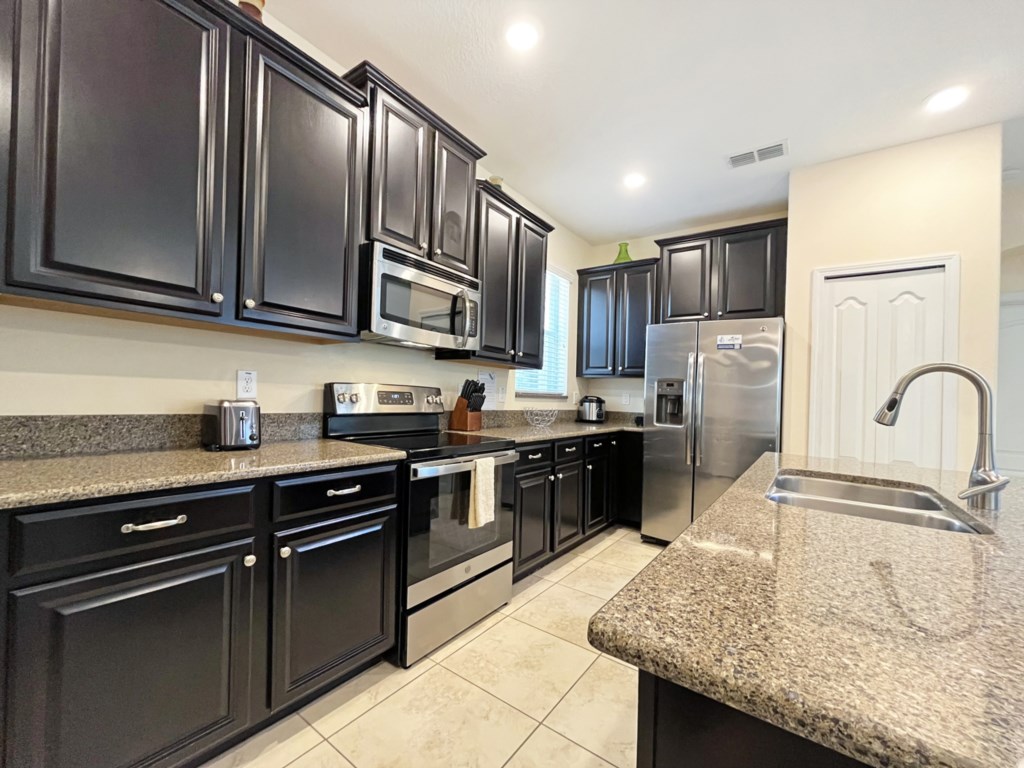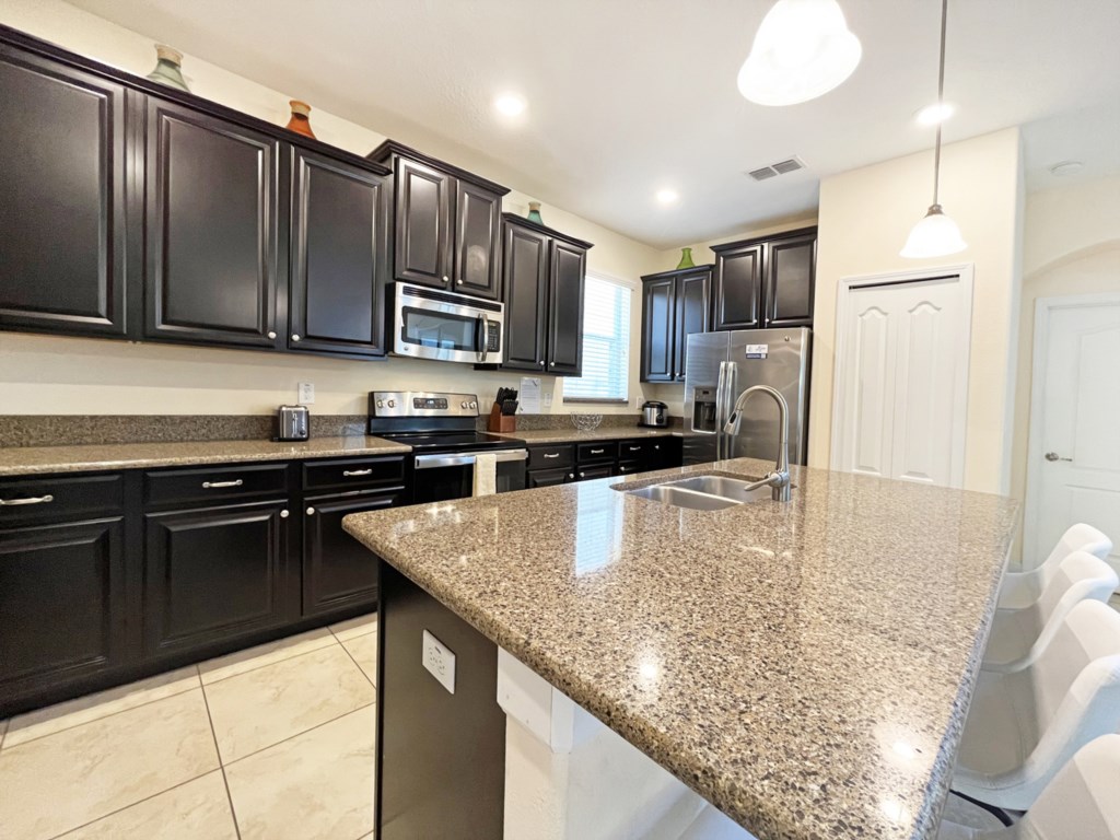 The modern kitchen with stainless steel appliances and granite counters is fully equipped with everything you may need to cater for your family. There is a breakfast bar as well as dining table that seats 8. Or why not dine outdoors?