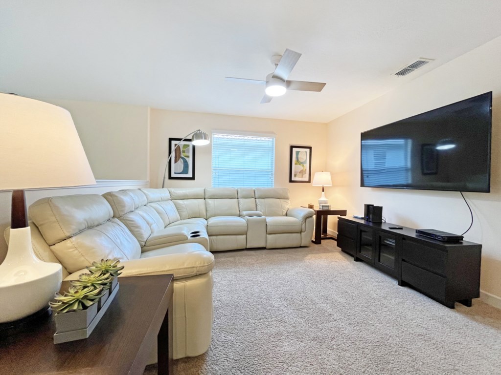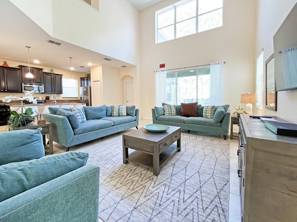 The central living room is a spacious double-height area with comfortable sofa seating and large screen TV for relaxing together. Cable TV and high speed internet are included. There is a second living area upstairs, offering plenty of space to spread out.