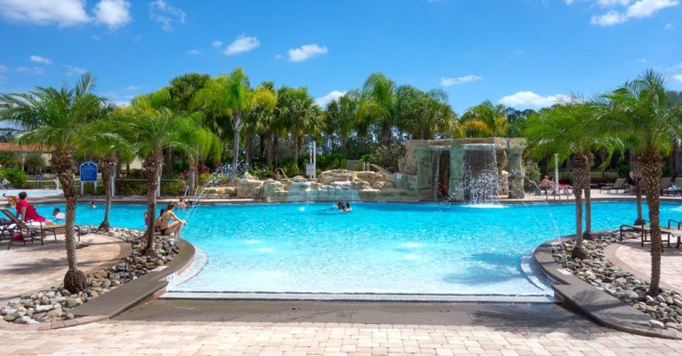 Paradise Palms Resort amenities include a 9,500 square foot prestigious Clubhouse with reception/concierge desk, spacious lounge, large games room with pool tables and arcade games, 50 seat movie theatre, state-of-the-art fitness facility with TV’s that overlooks the pool area, sauna, card room designed for competition playing, internet café free to guests, meeting rooms, kitchen for cooking for large parties, sundry shop and deli and tiki bar. Guests may bring their own DVD’s to the movie theatre for viewing. The main focus of the resort is the resort-style 5,000 sq. ft. lagoon pool complete with water slide and covered grotto. Surrounding the spectacular pool are jacuzzi spas, children’s water slide, a huge sun deck with plenty of loungers, tiki bar and grill with plenty of tables. In addition there are two floodlit tennis courts, basketball and volleyball courts, bocce ball, picnic and BBQ area for family cook-outs while enjoying the pool.