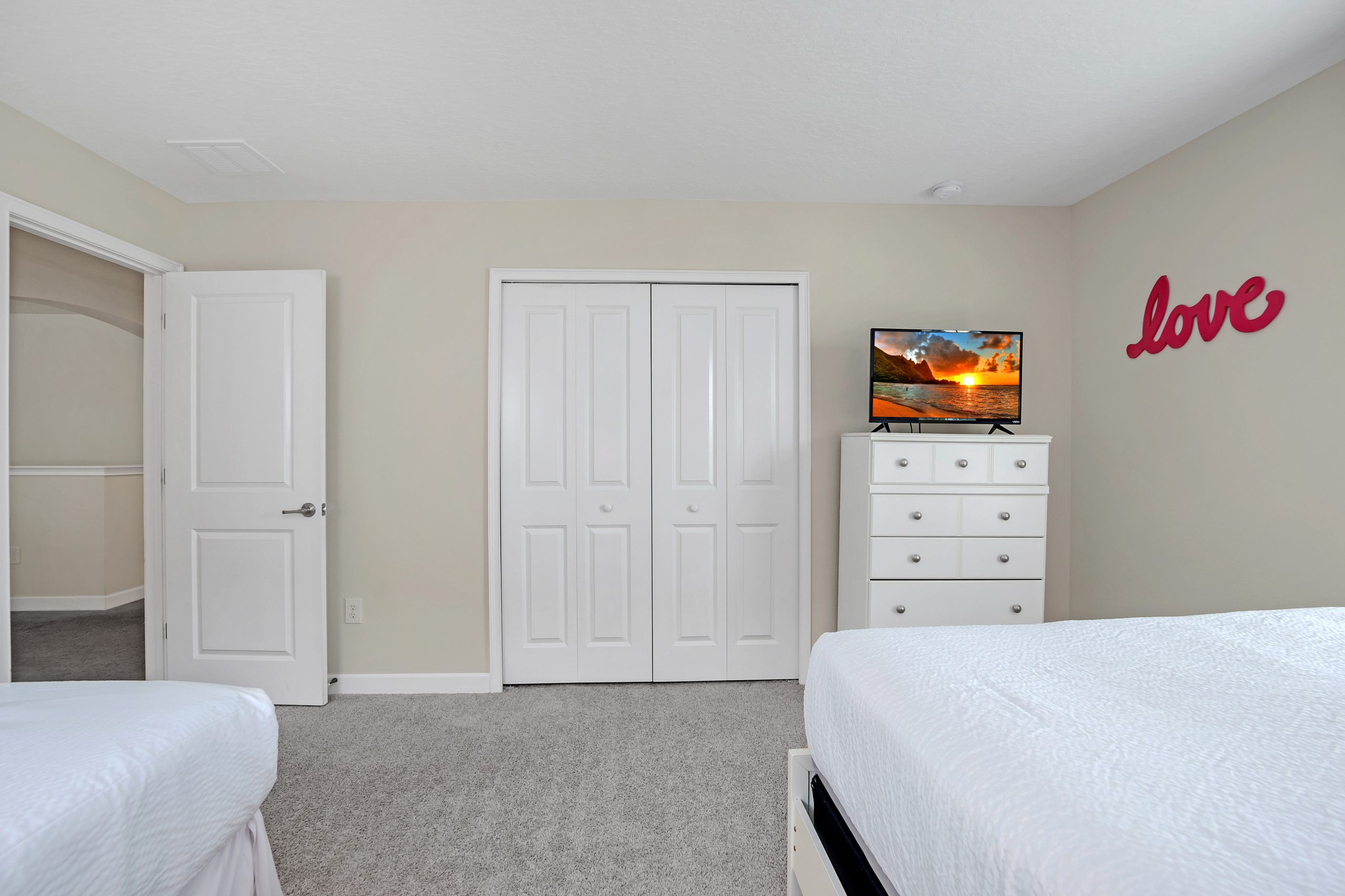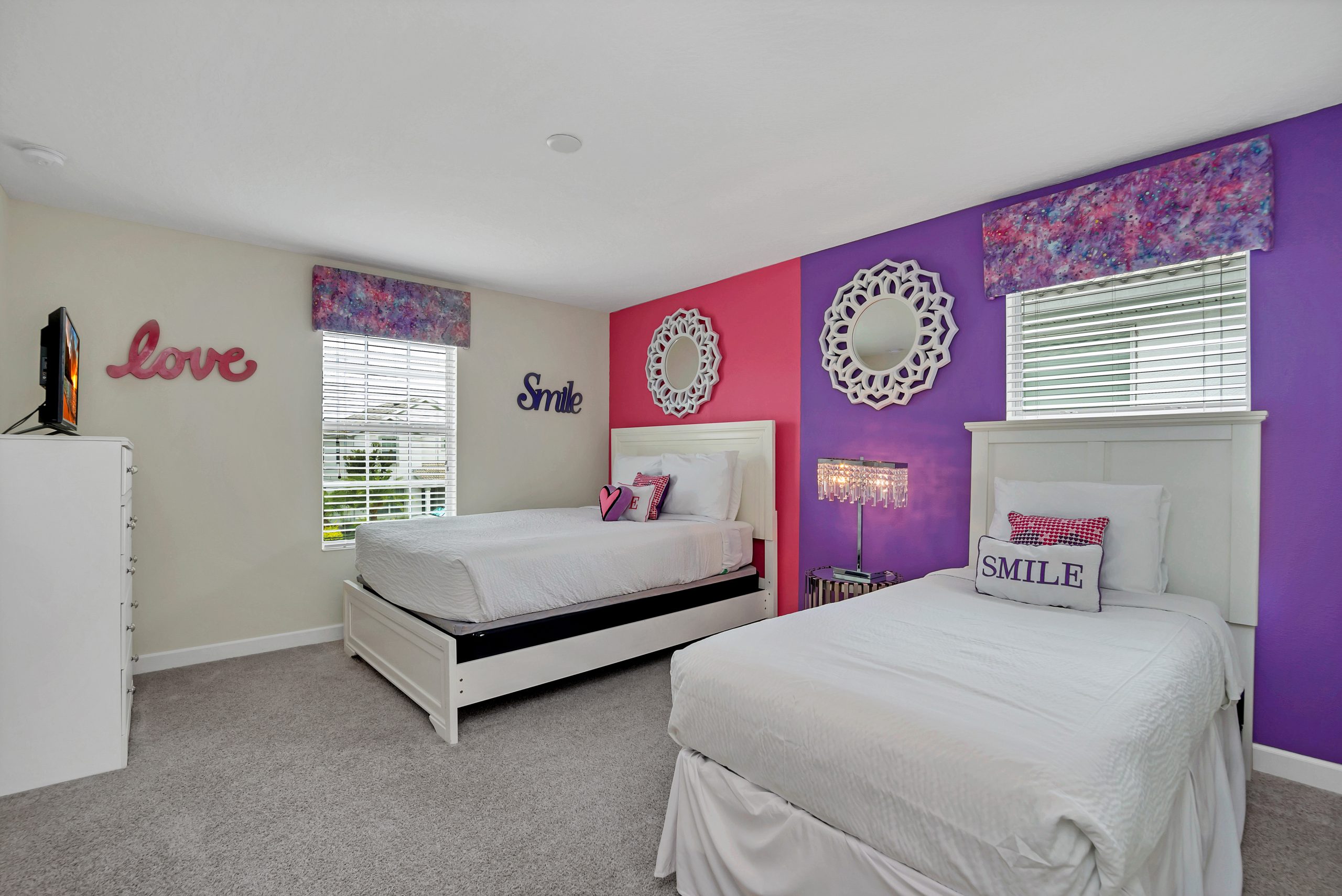 Bedroom #4 has a feminine touch that cannot be rivaled, showing off a pink and purple color palette! Cascading with female flare and chic décor, this boudoir features 1 full size bed, 1 twin bed, a tall dresser, and a flat-screen television.