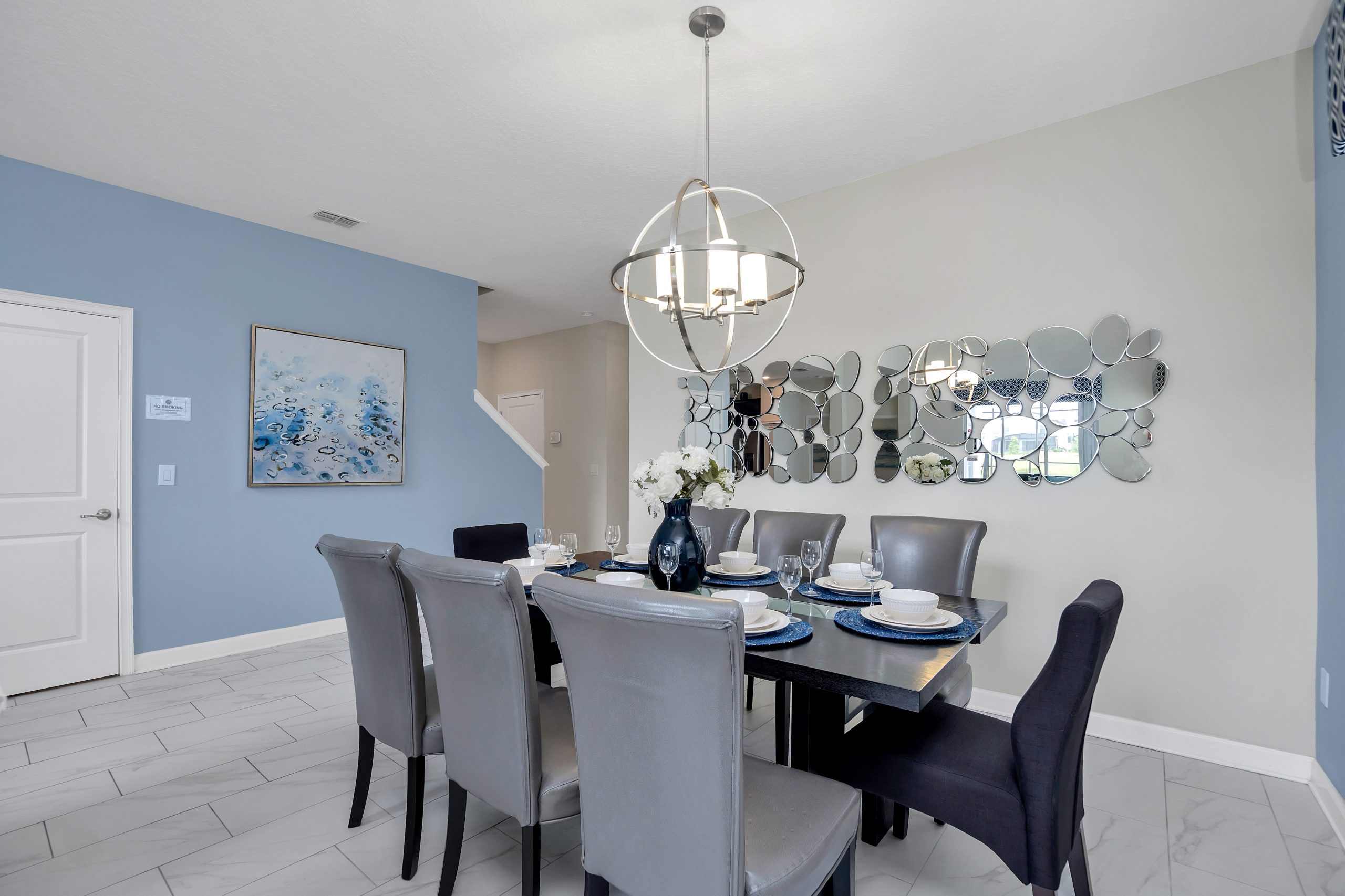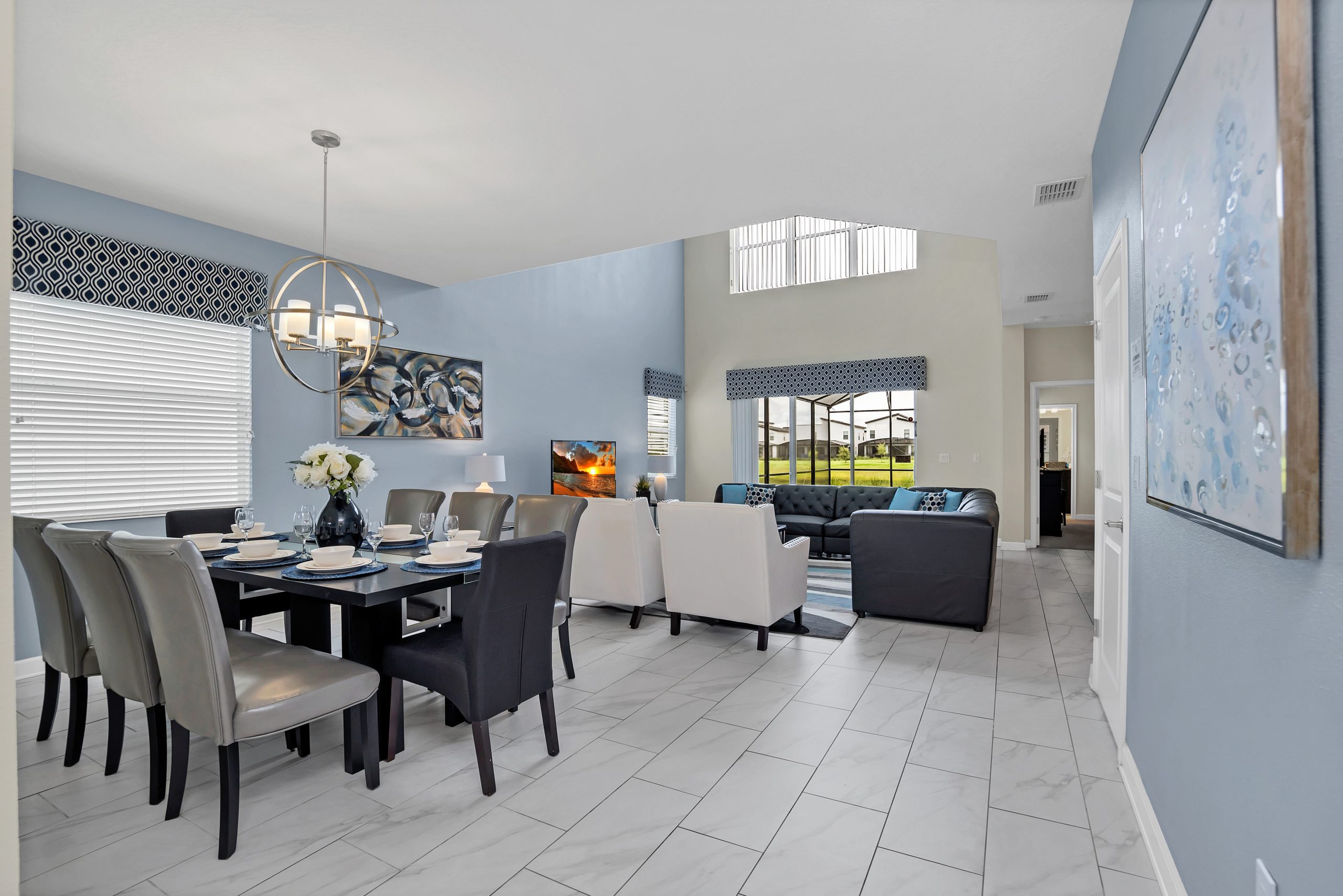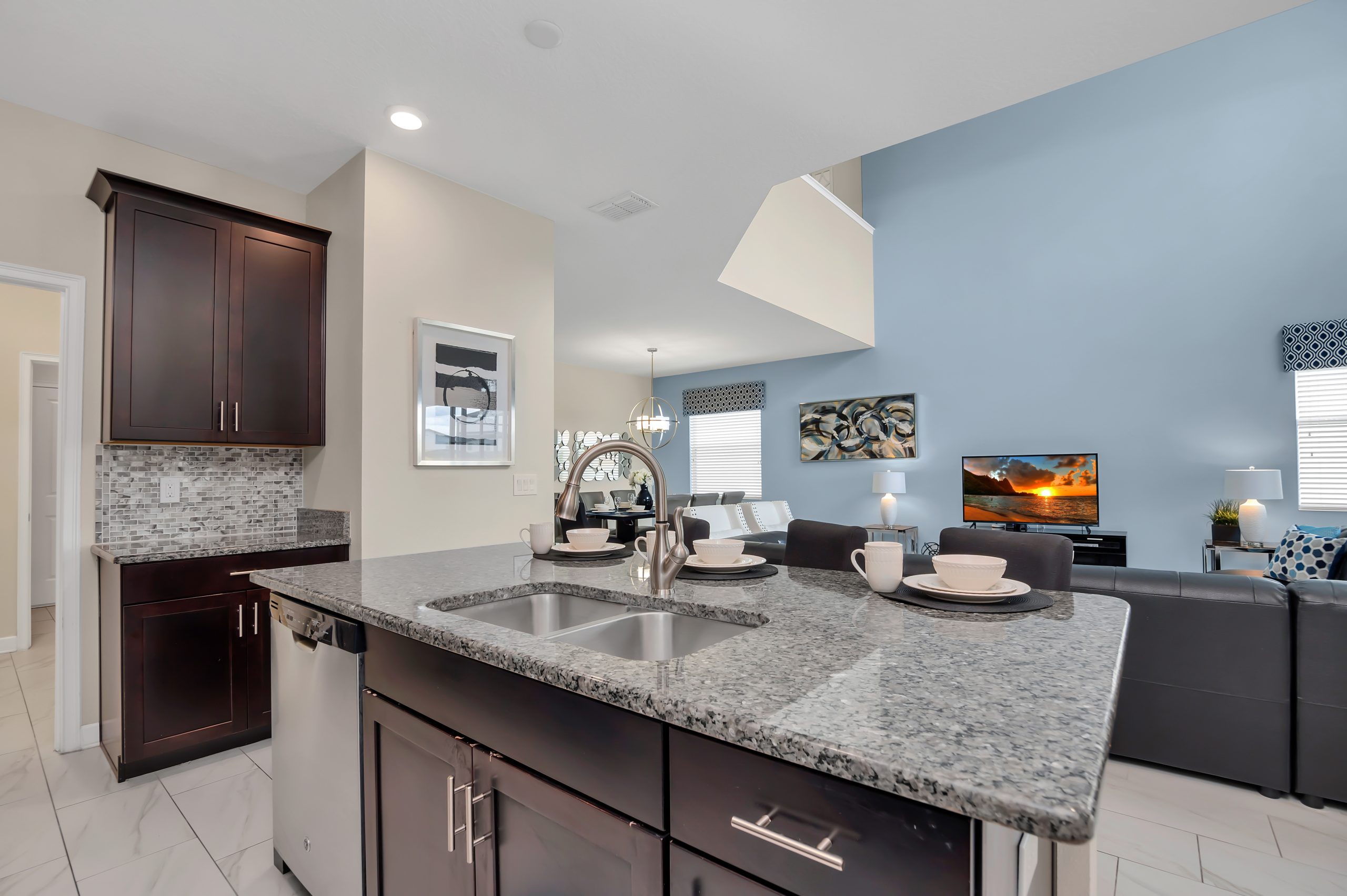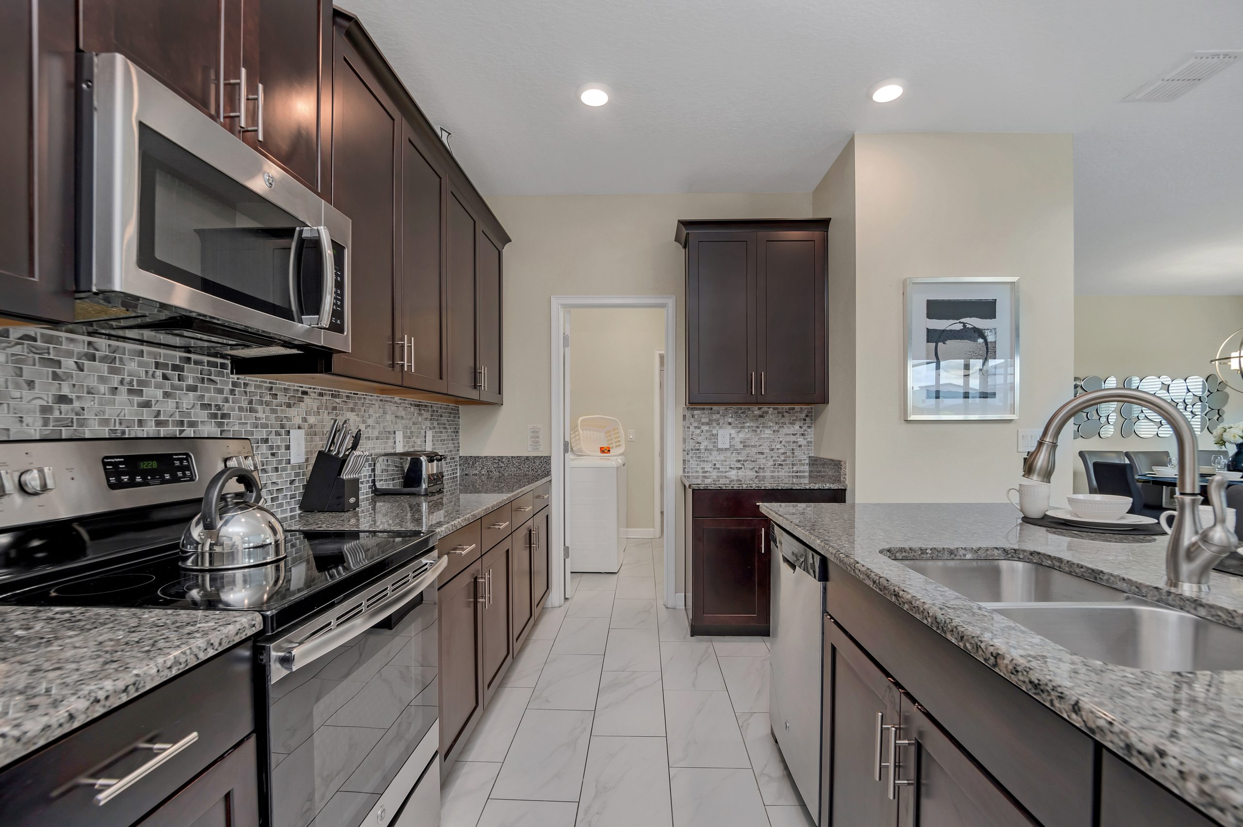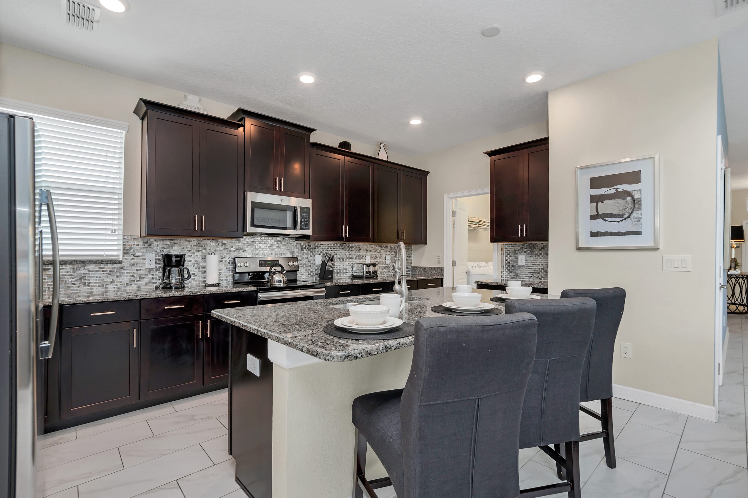 The spacious kitchen pulls out all the stops, showcasing granite countertops, handsome cabinetry, a gorgeous backsplash, and an endless array of stainless-steel appliances. Just a few feet away you will uncover the banquet area with a modern supper table, set with eight highbacked chairs.