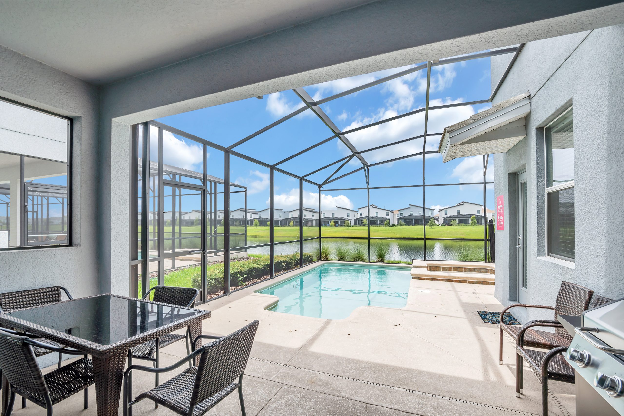 However, nothing compares to what comes next! Open the door and walk out onto your very own private screened-in lanai, dressed to impress with a pool, spa, grill, dining set, and stunning view!