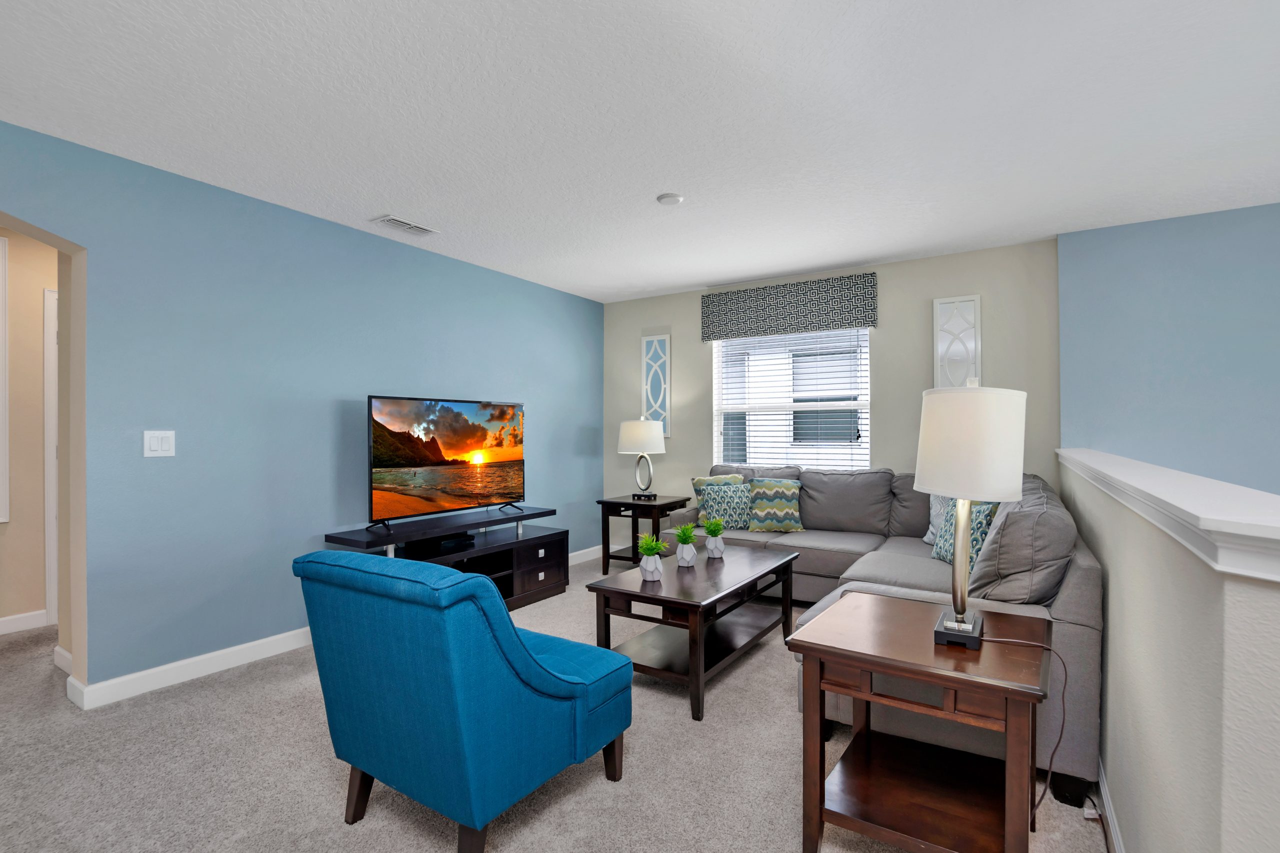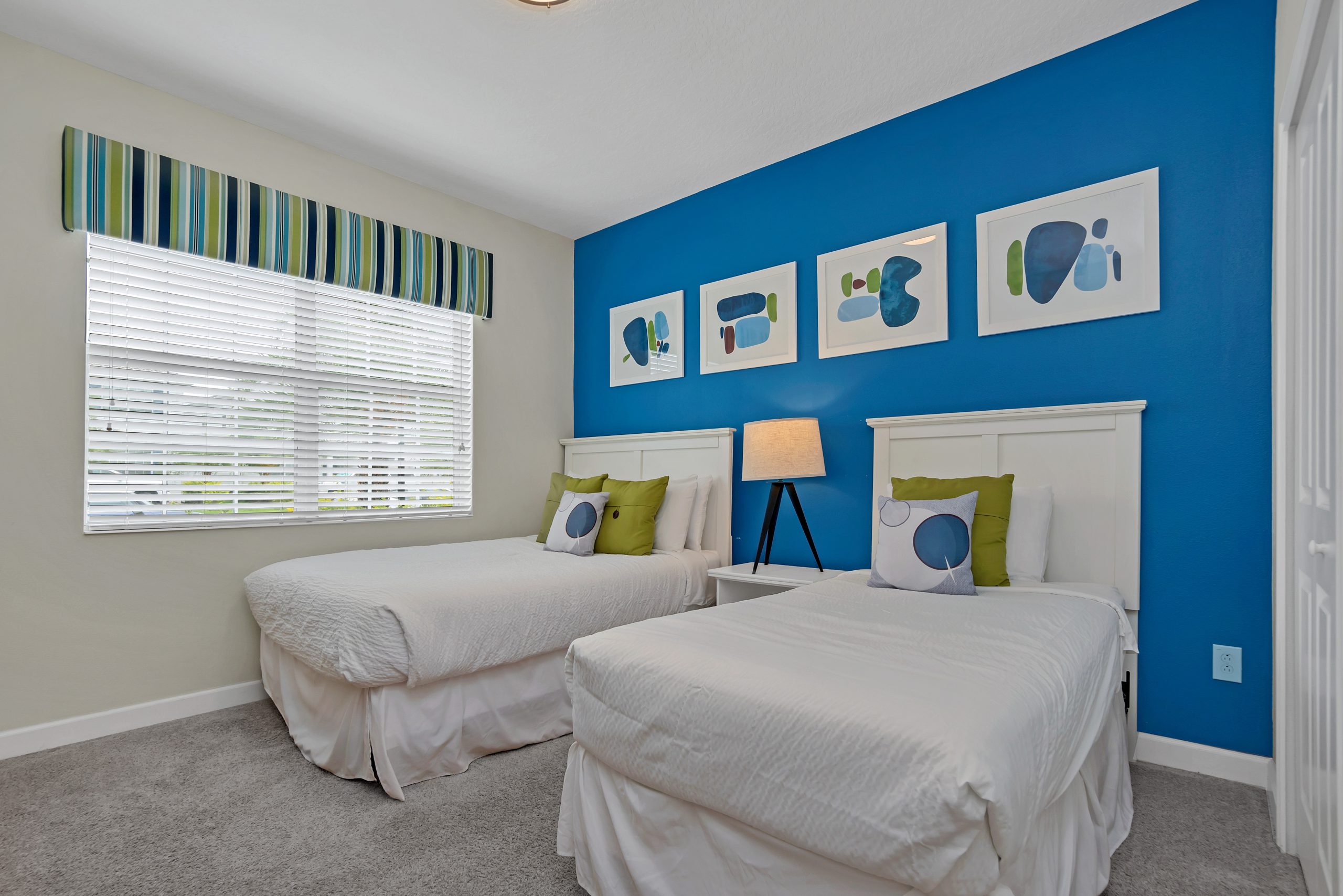 Bedroom #1 features 1 full size and 1 twin size bed, both with pristine white headboards, contrasting the vibrant blue accent wall exquisitely.