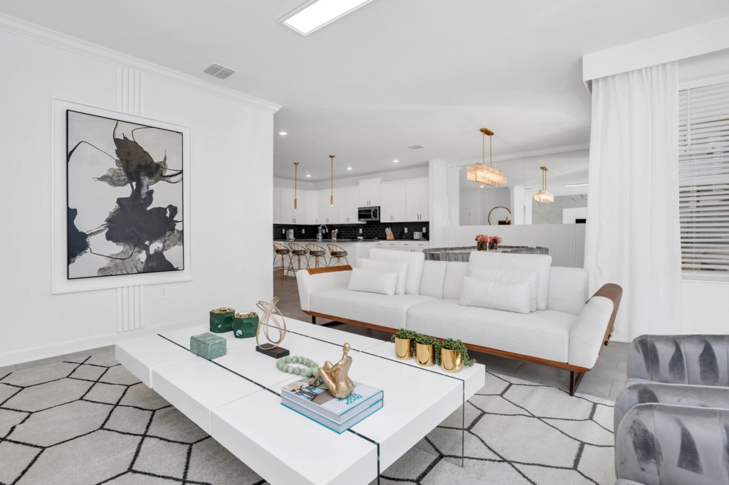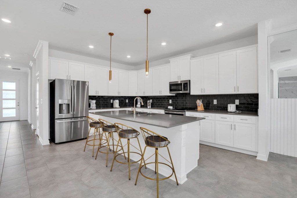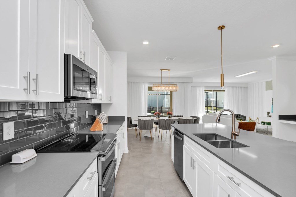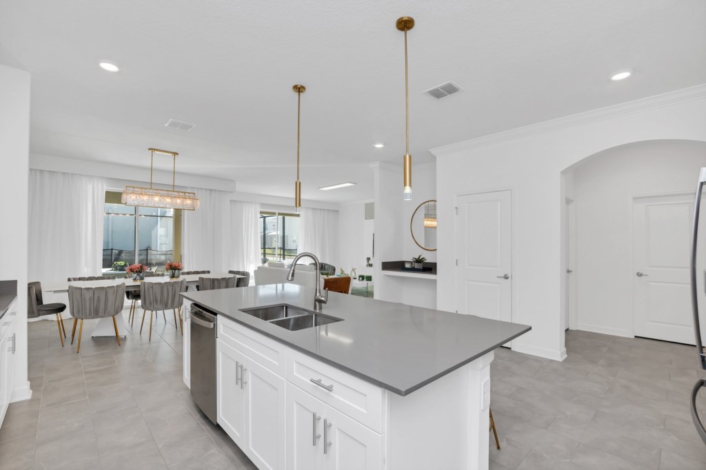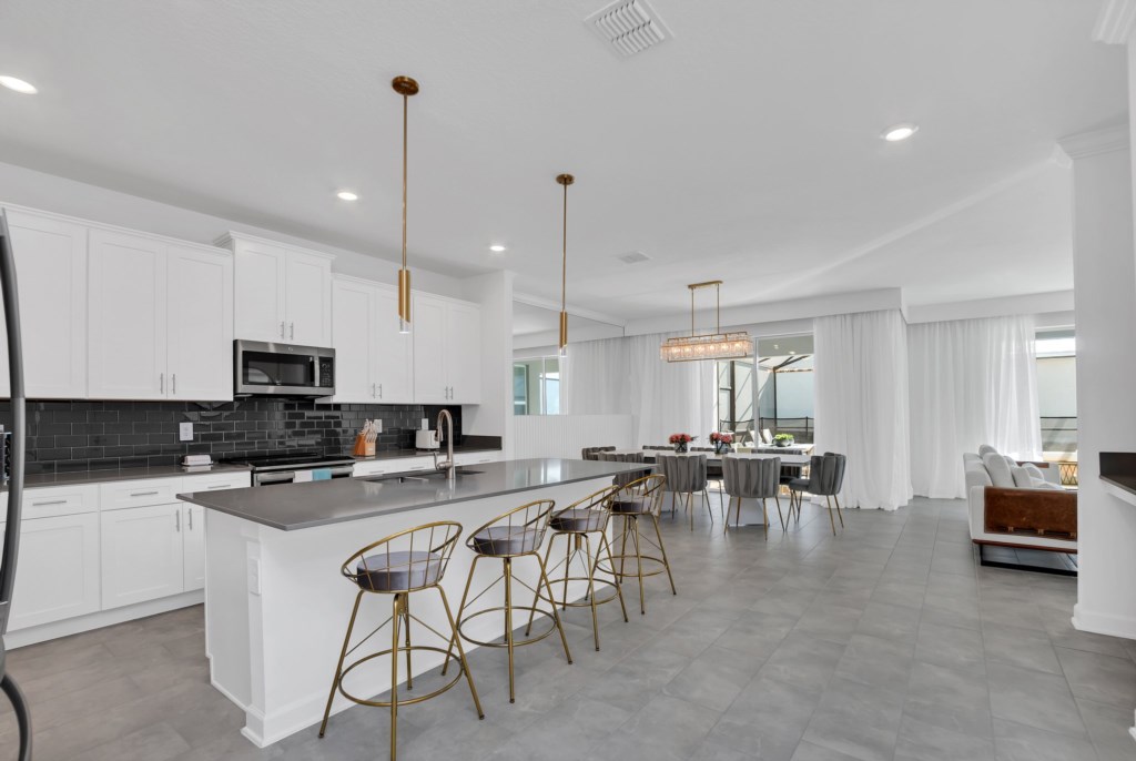 The open concept floor plan allows everyone to be together, whether you are hanging out watching your favorite show on one of the 55-inch flat screens or cooking dinner.