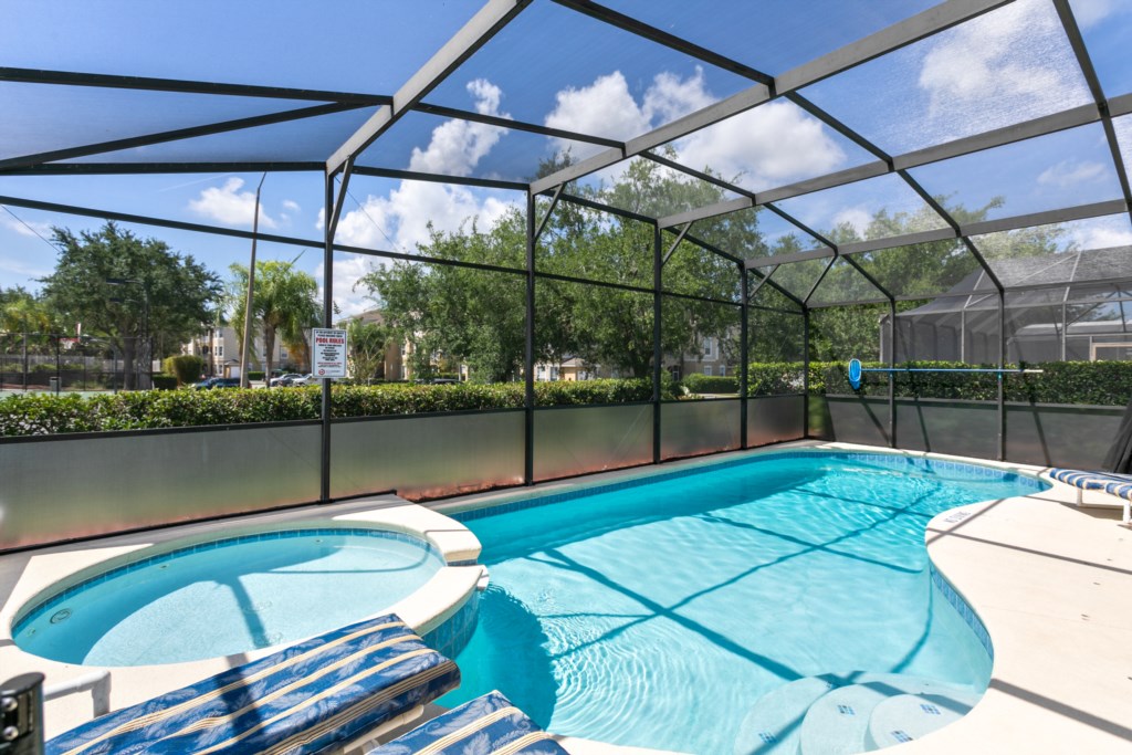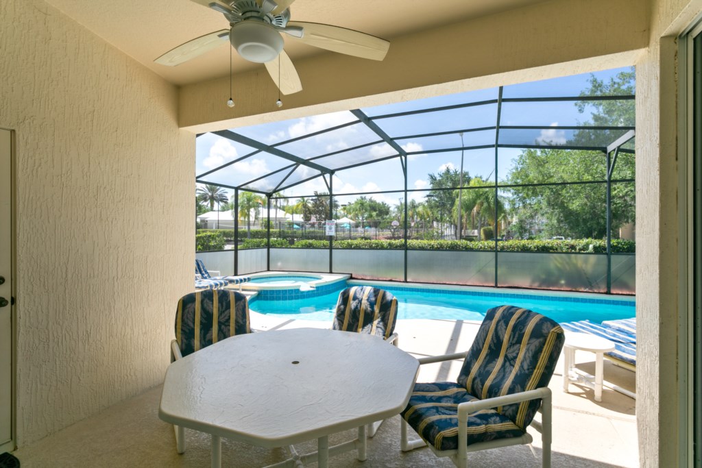 A heated (nominal fee for pool/spa heat) SOUTH FACING POOL AND SPA with a privacy hedge and no rear neighbors - providing private sunshine all day long. The pool and deck are oversized providing plenty of room for fun and relaxation on the deluxe loungers. Enjoy a relaxing breakfast on the lanai before you leave for a day of park hopping.