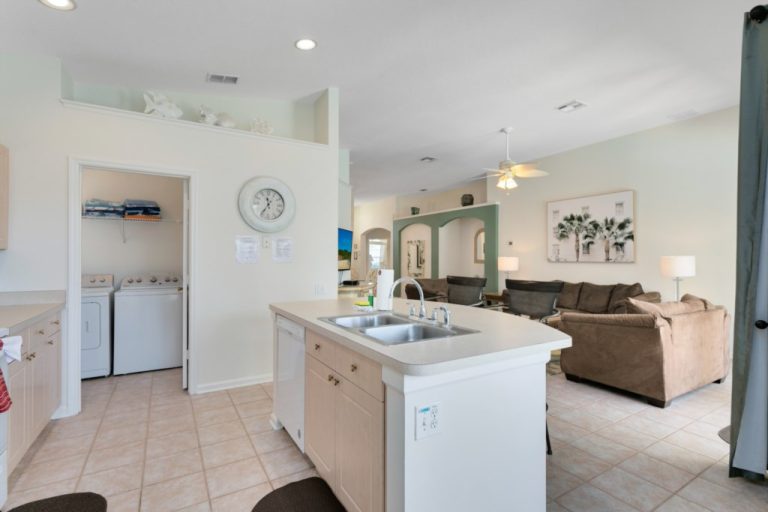 This spacious home has an open floor plan with a relaxing sitting area containing a sofa, coffee table, and flat screen tv. A dining area offers a place to enjoy meals, and a morning cup of coffee. Adjacent to the kitchen is a laundry room with a washer and dryer.